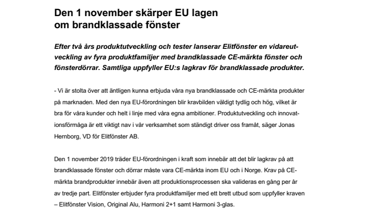 - Vi är stolta över att äntligen kunna erbjuda våra nya brandklassade och CE-märkta produkter på marknaden. Med den nya EU-förordningen blir kravbilden väldigt tydlig och hög, vilket är bra för våra kunder och helt i linje med våra egna ambitioner. Produktutveckling och innovationsförmåga är ett viktigt nav i vår verksamhet som ständigt driver oss framåt, säger Jonas Hernborg, VD för Elitfönster AB.