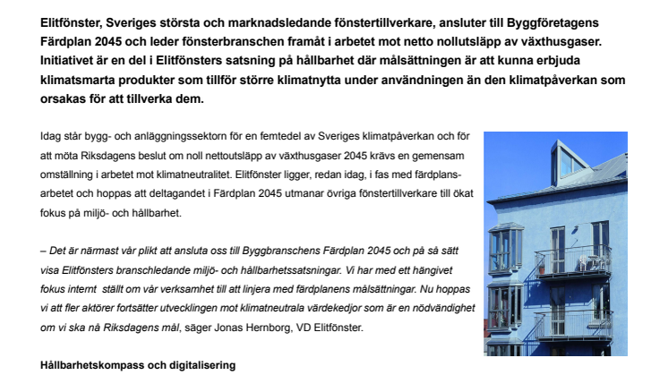 Elitfönster, Sveriges största och marknadsledande fönstertillverkare, ansluter till Byggföretagens Färdplan 2045 och leder fönsterbranschen framåt i arbetet mot netto nollutsläpp av växthusgaser. Initiativet är en del i Elitfönsters satsning på hållbarhet där målsättningen är att kunna erbjuda klimatsmarta produkter som tillför större klimatnytta under användningen än den klimatpåverkan som orsakas för att tillverka dem.