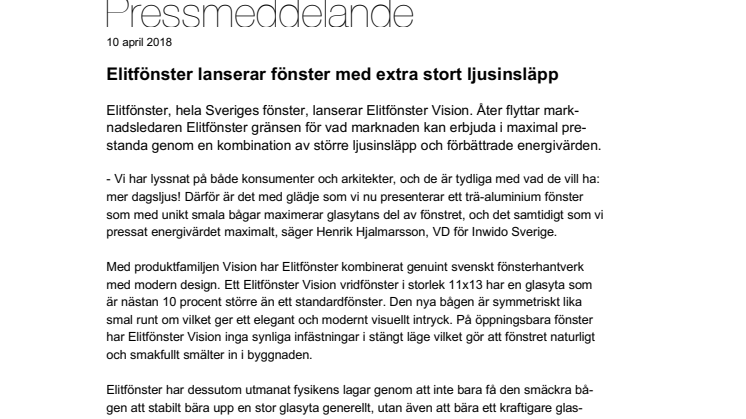 Elitfönster, hela Sveriges fönster, lanserar Elitfönster Vision. Åter flyttar marknadsledaren Elitfönster gränsen för vad marknaden kan erbjuda i maximal prestanda genom en kombination av större ljusinsläpp och förbättrade energivärden.