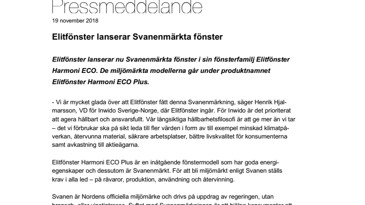 - Vi är mycket glada över att Elitfönster fått denna Svanenmärkning, säger Henrik Hjalmarsson, VD för Inwido Sverige-Norge, där Elitfönster ingår. För Inwido är det prioriterat att agera hållbart och ansvarsfullt. Vår långsiktiga hållbarhetsfilosofi är att ge mer än vi tar – det vi förbrukar ska på sikt leda till fler värden i form av till exempel minskad klimatpåverkan, återvunna material, säkrare arbetsplatser, bättre livskvalitet för konsumenterna samt avkastning till aktieägarna.