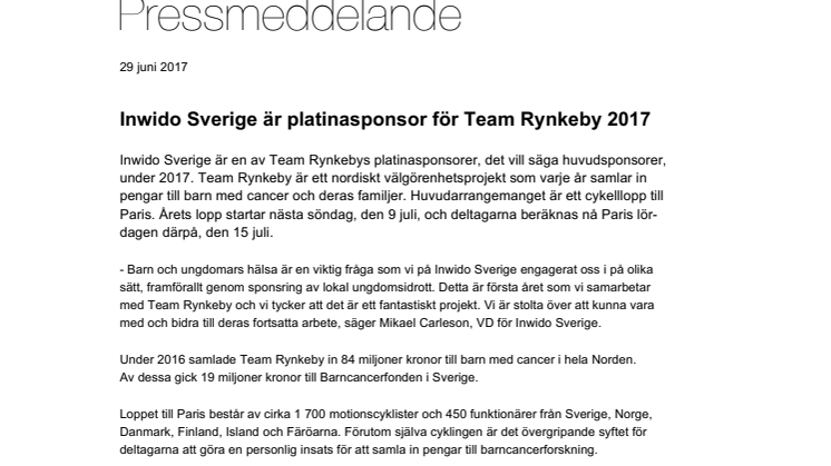 Inwido Sverige är en av Team Rynkebys platinasponsorer, det vill säga huvudsponsorer, under 2017. Team Rynkeby är ett nordiskt välgörenhetsprojekt som varje år samlar in pengar till barn med cancer och deras familjer. Huvudarrangemanget är ett cykelllopp till Paris. Årets lopp startar nästa söndag, den 9 juli, och deltagarna beräknas nå Paris lördagen därpå, den 15 juli.