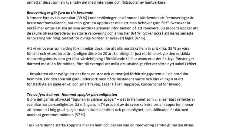 Svenskarnas hem speglar deras personligheter och för många kan en renovering av hemmet bli som en personlig make-over. En av fyra säger sig ha blivit en ny människa av den senaste renoveringen. Ännu fler, 39 procent, menar att det är beroendeframkallande att renovera. Det är några av slutsatserna i rapporten ”Renovera hemma – himmel eller helvete?”, framtagen av Kairos Future på uppdrag av Inwido, Europas största leverantör av fönster och dörrar.