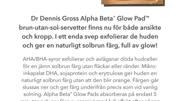 Dr Dennis Gross Alpha Beta® Glow Pad™ brun-utan-sol- servetter finns nu för både ansikte och kropp. I ett enda svep exfolierar de huden och ger en naturligt solbrun färg, full av glow!