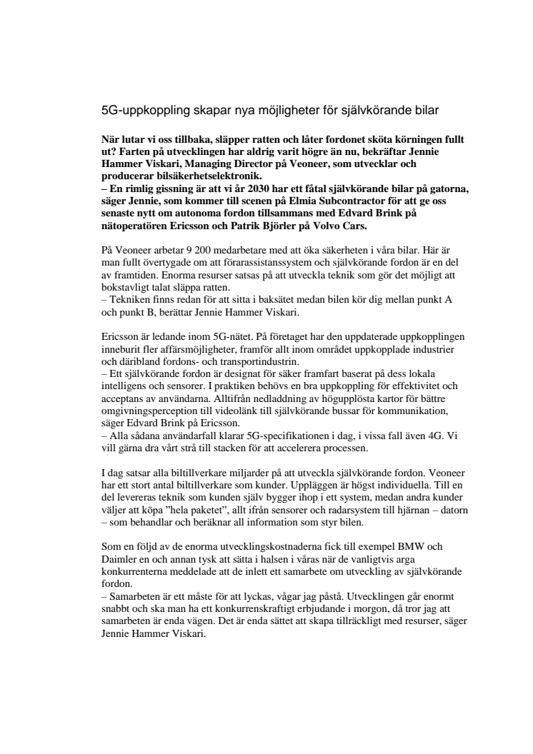 – En rimlig gissning är att vi år 2030 har ett fåtal självkörande bilar på gatorna, säger Jennie Hammer Viskari, Managing Director på Veoneer, som kommer till scenen på Elmia Subcontractor för att ge oss senaste nytt om autonoma fordon tillsammans med Edvard Brink på nätoperatören Ericsson och Patrik Björler på Volvo Cars.
