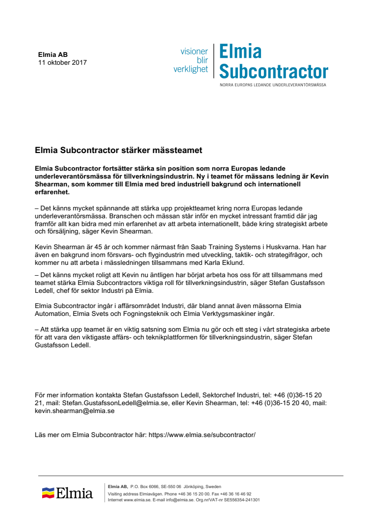 Elmia Subcontractor fortsätter stärka sin position som norra Europas ledande underleverantörsmässa för tillverkningsindustrin. Ny i teamet för mässans ledning är Kevin Shearman, som kommer till Elmia med bred industriell bakgrund och internationell erfarenhet.