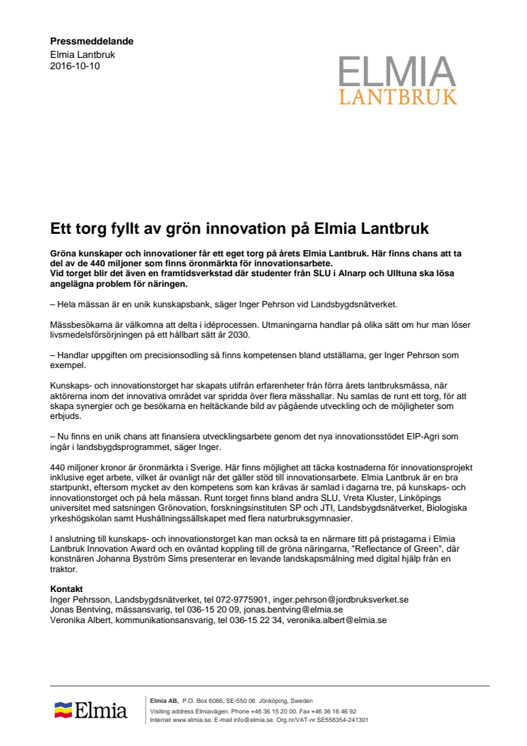 Gröna kunskaper och innovationer får ett eget torg på årets Elmia Lantbruk. Här finns chans att ta del av de 440 miljoner som finns öronmärkta för innovationsarbete. Vid torget finns även en framtidsverkstad där studenter från SLU i Alnarp och Ultuna ska lösa angelägna problem för näringen.