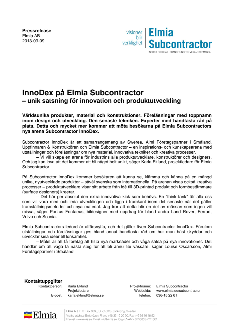 Världsunika produkter, material och konstruktioner. Föreläsningar med toppnamn inom design och utveckling. Den senaste tekniken. Experter med handfasta råd på plats. Detta och mycket mer kommer att möta besökarna på Elmia Subcontractors nya arena Subcontractor InnoDex.