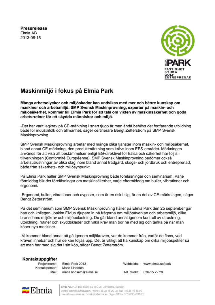 Många arbetsolyckor och miljöskador kan undvikas med mer och bättre kunskap om maskiner och arbetsmiljö. SMP Svensk Maskinprovning, experter på maskin- och miljösäkerhet, kommer till Elmia Park för att tala om vikten av maskinsäkerhet och goda arbetsrutiner för att skydda människor och miljö.