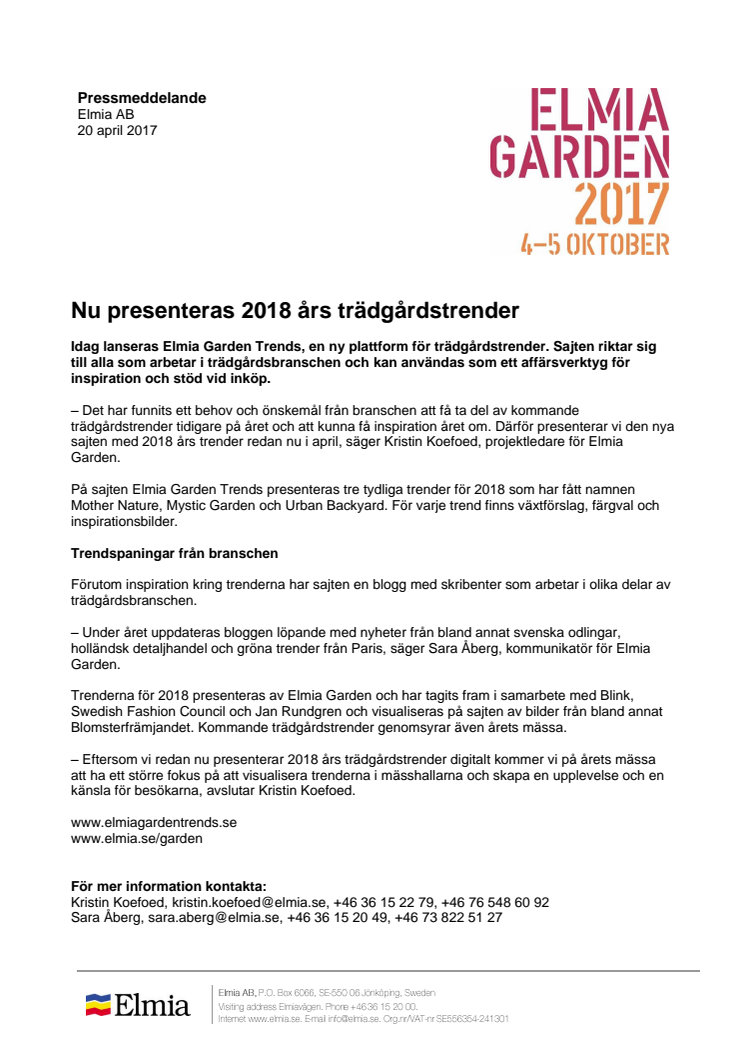 Idag lanseras Elmia Garden Trends, en ny plattform för trädgårdstrender. Sajten riktar sig till alla som arbetar i trädgårdsbranschen och kan användas som ett affärsverktyg för inspiration och stöd vid inköp.