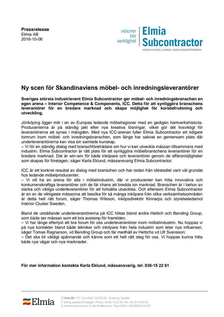 Sveriges största industrievent Elmia Subcontractor ger möbel- och inredningsbranschen en egen arena – Interior Competence & Components, ICC. Detta för att synliggöra branschens leverantörer för en bredare marknad och skapa möjlighet för korsbefruktning och utveckling.