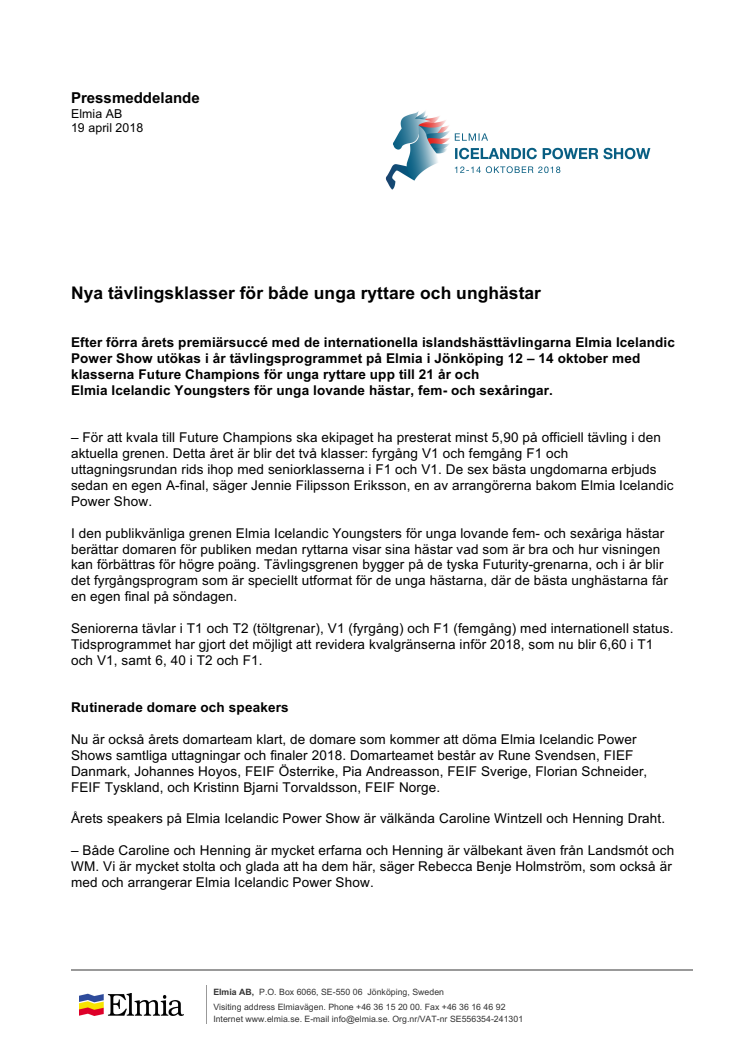 Efter förra årets premiärsuccé med de internationella islandshästtävlingarna Elmia Icelandic Power Show utökas i år tävlingsprogrammet på Elmia i Jönköping 12 – 14 oktober med klasserna Future Champions för unga ryttare upp till 21 år och Elmia Icelandic Youngsters för unga lovande hästar, fem- och sexåringar.