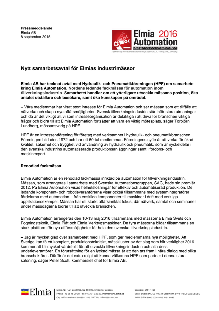Elmia AB har tecknat avtal med Hydraulik- och Pneumatikföreningen (HPF) om samarbete kring Elmia Automation, Nordens ledande fackmässa för automation inom tillverkningsindustrin. Samarbetet handlar om att ytterligare utveckla mässans position, öka antalet utställare och besökare, samt öka kunskapen på området. Mässan arrangeras på Elmia i Jönköping 10-13 maj 2016.