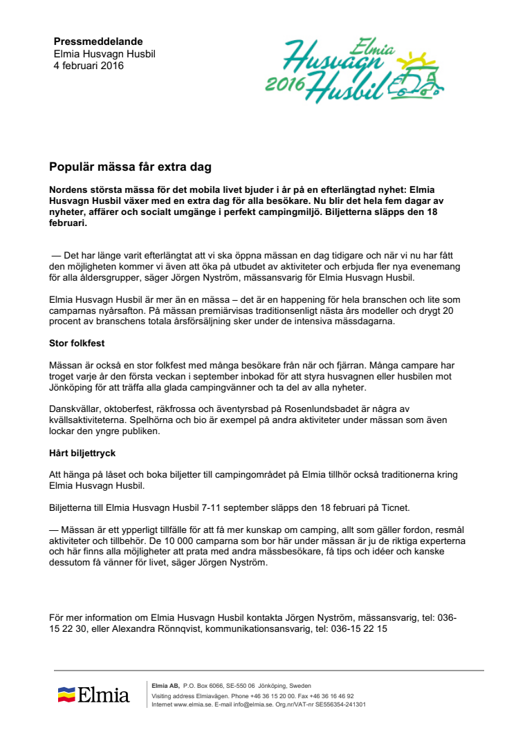 Nordens största mässa för det mobila livet bjuder i år på en efterlängtad nyhet: Elmia Husvagn Husbil växer med en extra dag för alla besökare. Nu blir det hela fem dagar av nyheter, affärer och socialt umgänge i perfekt campingmiljö, på Elmia i Jönköping i september. Biljetterna släpps den 18 februari.
