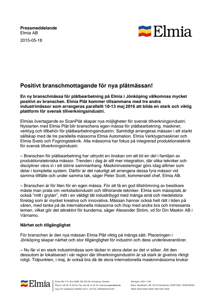 Den nya branschmässan för plåtbearbetning på Elmia i Jönköping välkomnas mycket positivt av branschen. Elmia Plåt kommer tillsammans med tre andra industrimässor som arrangeras parallellt 10-13 maj 2016 att bilda en stark och viktig plattform för svensk tillverkningsindustri.