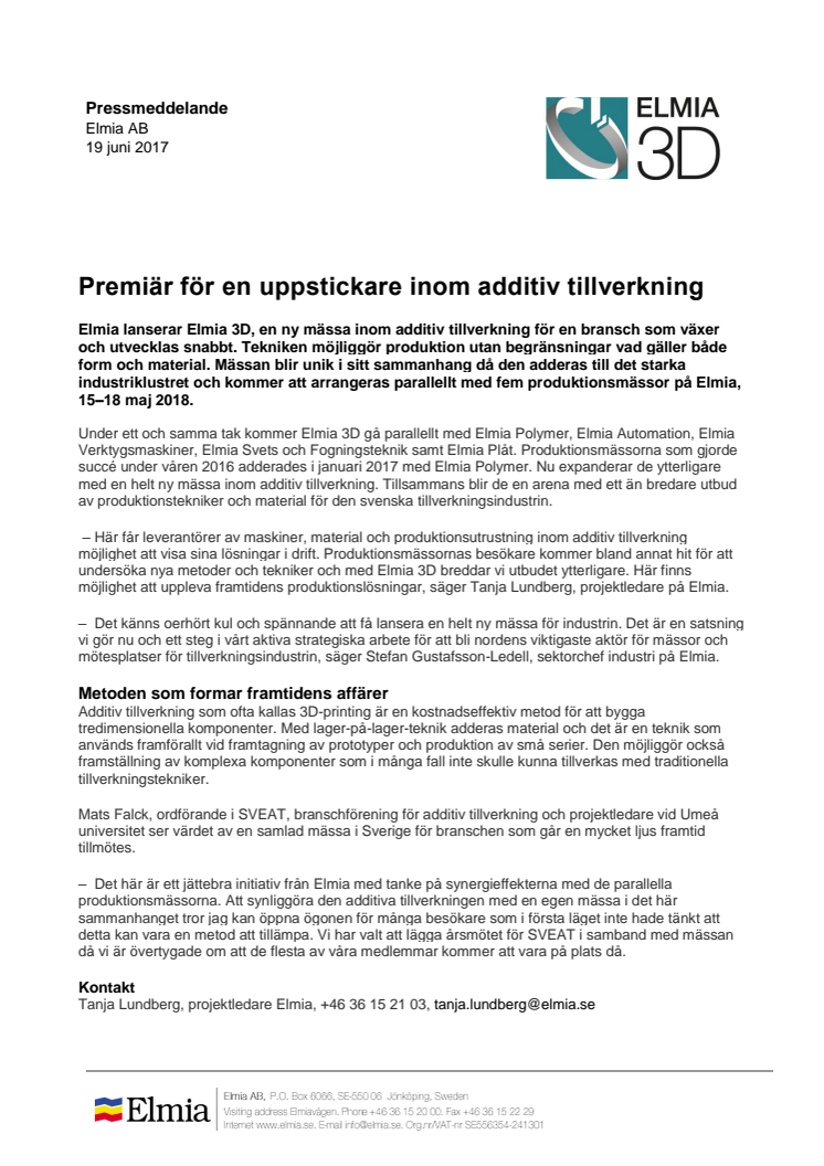 Elmia lanserar Elmia 3D, en ny mässa inom additiv tillverkning för en bransch som växer och utvecklas snabbt. Tekniken möjliggör produktion utan begränsningar vad gäller både form och material. Mässan blir unik i sitt sammanhang då den adderas till det starka industriklustret och kommer att arrangeras parallellt med fem produktionsmässor på Elmia, 15–18 maj 2018.