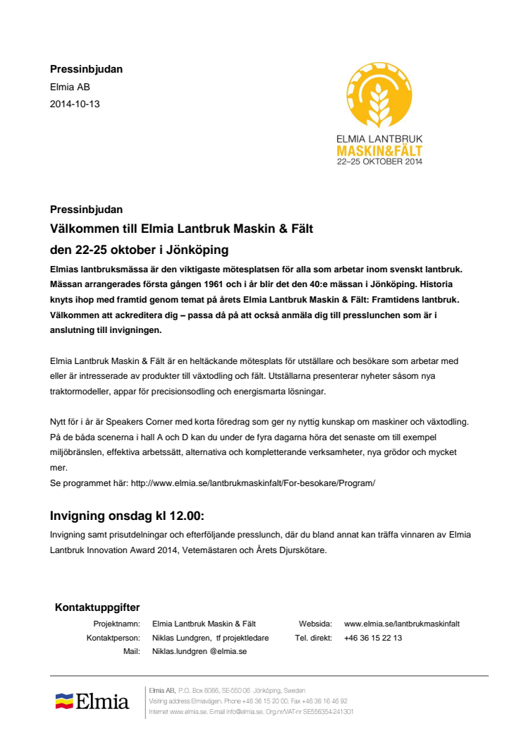 Elmias lantbruksmässa är den viktigaste mötesplatsen för alla som arbetar inom svenskt lantbruk. Mässan arrangerades första gången 1961 och i år blir det den 40:e mässan i Jönköping. Historia knyts ihop med framtid genom temat på årets Elmia Lantbruk Maskin & Fält: Framtidens lantbruk. Välkommen att ackreditera dig –passa då på att anmäla dig till presslunchen som är i anslutning till invigningen.