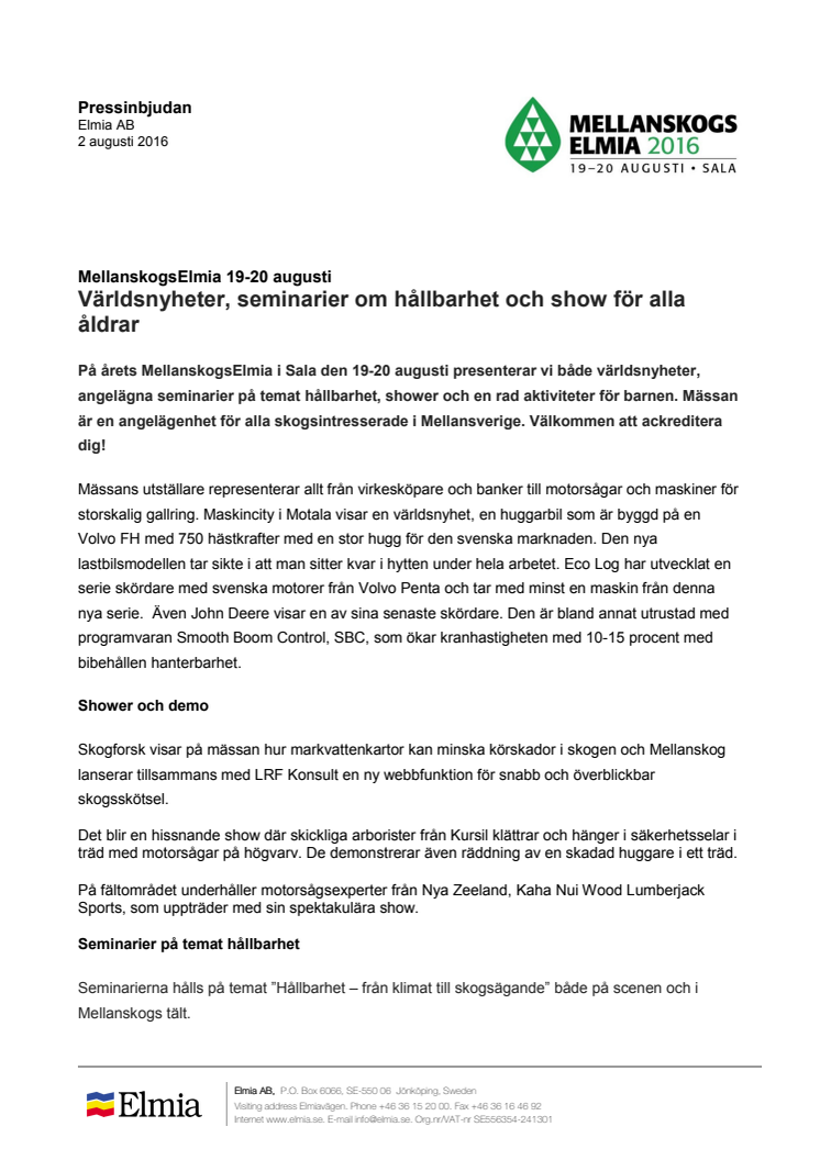 På årets MellanskogsElmia i Sala den 19-20 augusti presenterar vi både världsnyheter, angelägna seminarier på temat hållbarhet, shower och en rad aktiviteter för barnen. Mässan är en angelägenhet för alla skogsintresserade i Mellansverige. Välkommen att ackreditera dig!