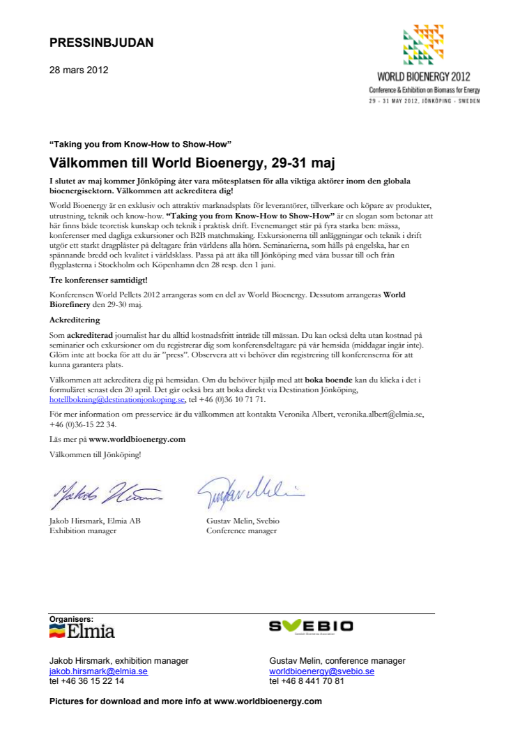 PRESSINBJUDAN: “Taking you from Know-How to Show-How” - Välkommen till World Bioenergy, 29-31 maj