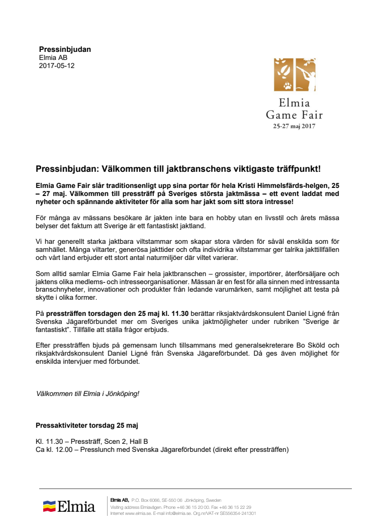 Elmia Game Fair slår traditionsenligt upp sina portar för hela Kristi Himmelsfärdshelgen, 25 – 27 maj. Välkommen till pressträff på Sveriges största jaktmässa – ett event laddat med nyheter och spännande aktiviteter för alla som har jakt som sitt stora intresse!