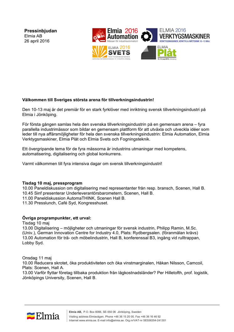 Den 10-13 maj är det premiär för en stark fyrklöver med inriktning svensk tillverkningsindustri på Elmia i Jönköping. Fyra parallella industrimässor bildar en gemensam plattform för att utväxla och utveckla idéer som leder till nya affärsmöjligheter för hela den svenska tillverkningsindustrin: Elmia Automation, Elmia Verktygsmaskiner, Elmia Plåt och Elmia Svets och Fogningsteknik.