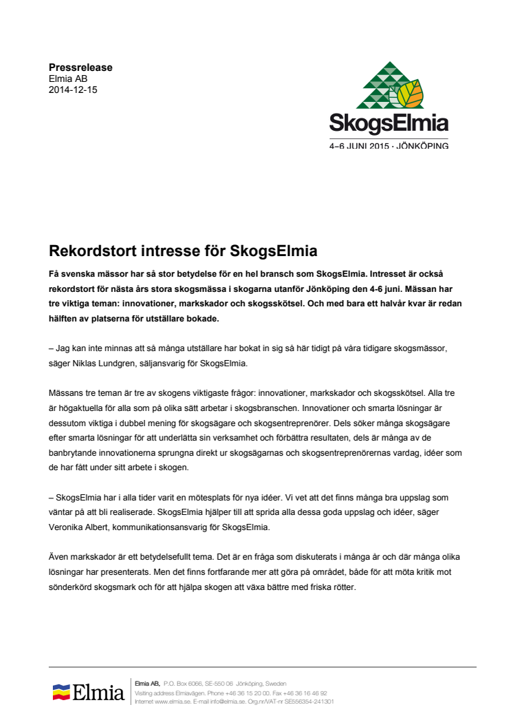 Få svenska mässor har så stor betydelse för en hel bransch som SkogsElmia. Intresset är också rekordstort för nästa års stora skogsmässa i skogarna utanför Jönköping den 4-6 juni. Mässan har tre viktiga teman: innovationer, markskador och skogsskötsel. Och med bara ett halvår kvar är redan hälften av platserna för utställare bokade.