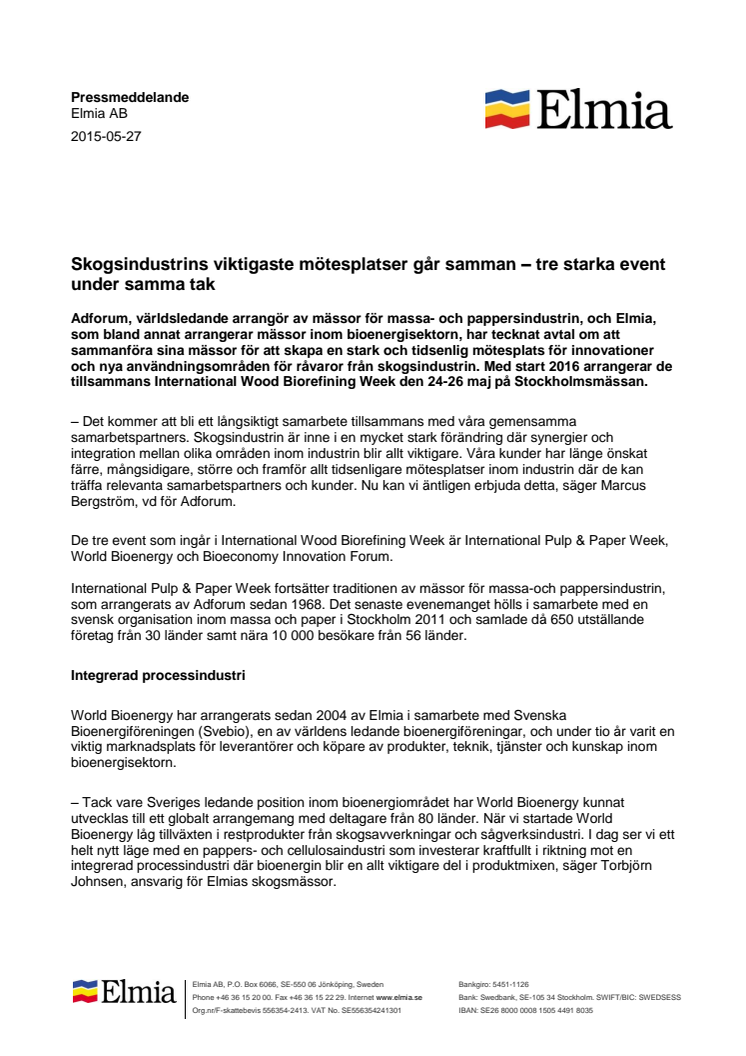 Adforum, världsledande arrangör av mässor för massa- och pappersindustrin, och Elmia, som bland annat arrangerar mässor inom bioenergisektorn, har tecknat avtal om att sammanföra sina mässor till en stark mötesplats för innovationer och nya användningsområden för skogsindustrins råvaror. Med start 2016 arrangerar de tillsammans International Wood Biorefining Week den 24-26 maj på Stockholmsmässan.