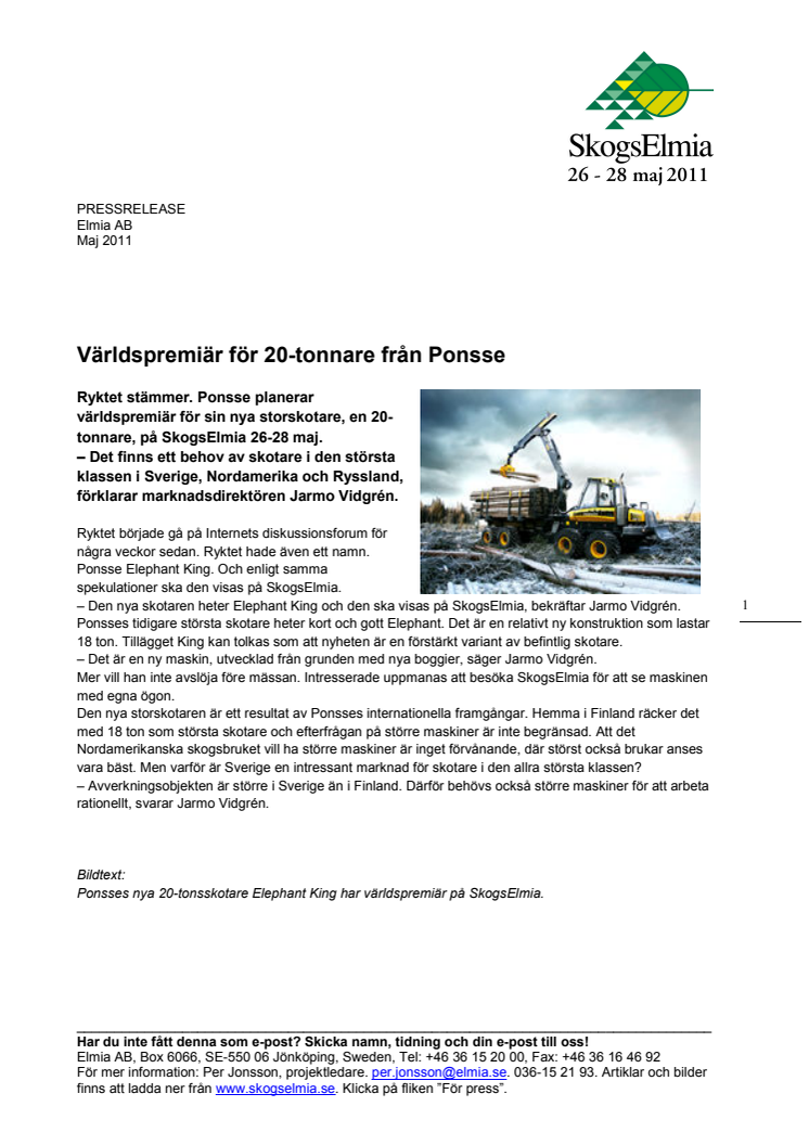 Ryktet stämmer. Ponsse planerar världspremiär för sin nya storskotare, en 20-tonnare, på SkogsElmia 26-28 maj.