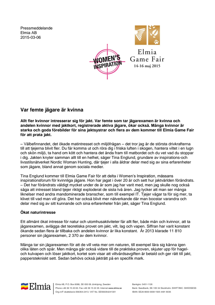 Allt fler kvinnor intresserar sig för jakt. Var femte som tar jägarexamen är kvinna och andelen kvinnor med jaktkort, registrerade aktiva jägare, ökar också. Jaktmässan Elmia Game Fair 14-16 maj satsar extra på de kvinnliga jägarna genom temat Women's Inspiration, där flera kvinnor berättar om sina erfarenheter och jakt som en livsstil. Vapen och kläder med bra tjejmått visas också på mässan.