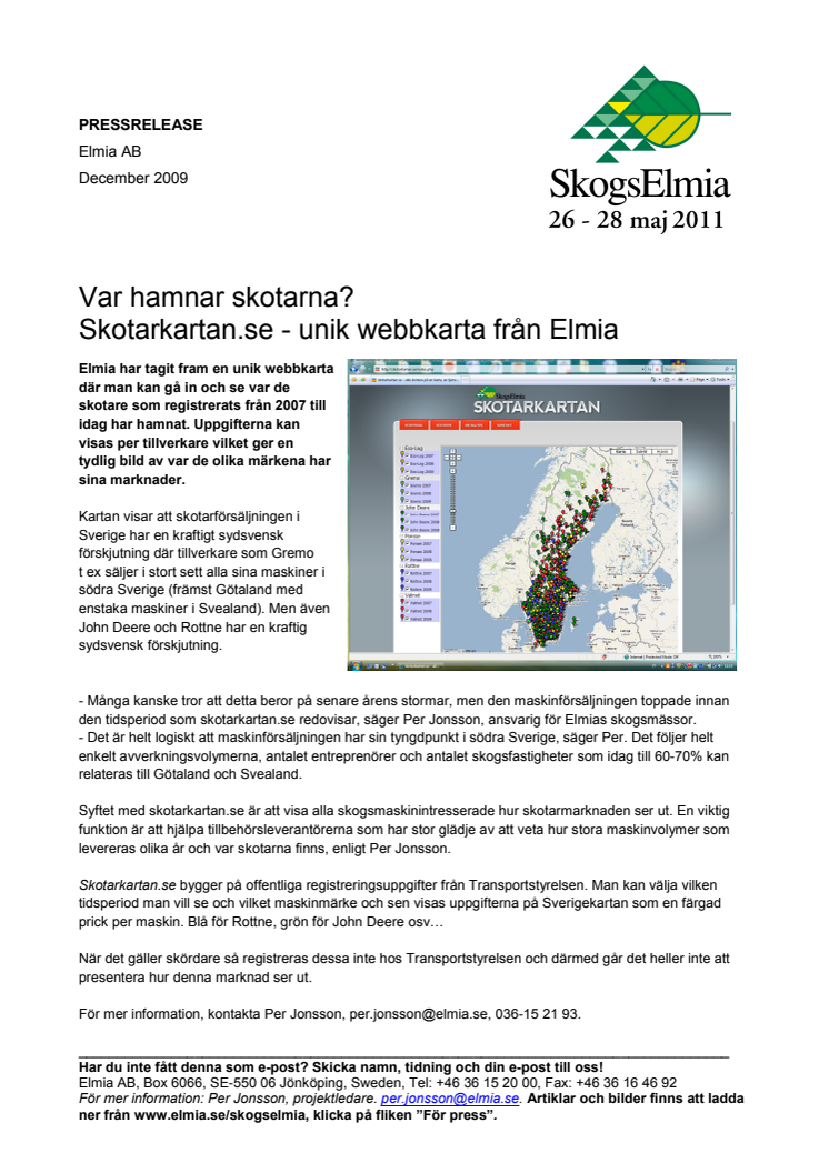 Elmia har tagit fram en unik webbkarta där man kan gå in och se var de skotare som registrerats från 2007 till idag har hamnat. Uppgifterna kan visas per tillverkare vilket ger en tydlig bild av var de olika märkena har sina marknader. Syftet med skotarkartan.se är att visa alla skogsmaskinintresserade hur skotarmarknaden ser ut, inte minst för tillbehörsleverantörerna, enligt Per Jonsson.