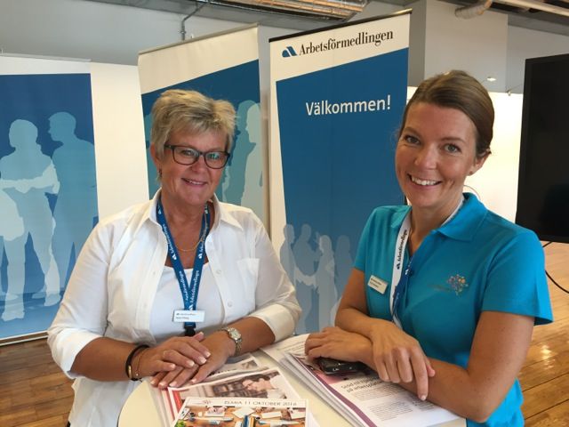 Anna Henebäck, till höger, och Anita Friberg finns på plats i Arbetsförmedlingens monter under hela mässan.