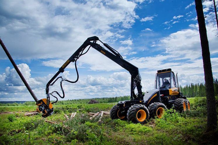 Den nya gallringsskördaren Fox har i likhet med Ponsses övriga skördare utrustats med en uppdaterad kran för lägre bränsleförbrukning.