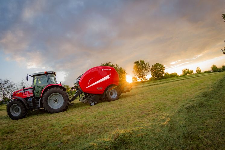 En non-stop kombipress med fixkammare som integrerar förkammare, presskammare och inplastade. FOTO: Kverneland.