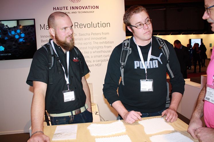 Lord Whistleton och Patrik Möller lyssnar noggrant på när Werner Hilliges från Almi berättar om det 3D-printade materialet.