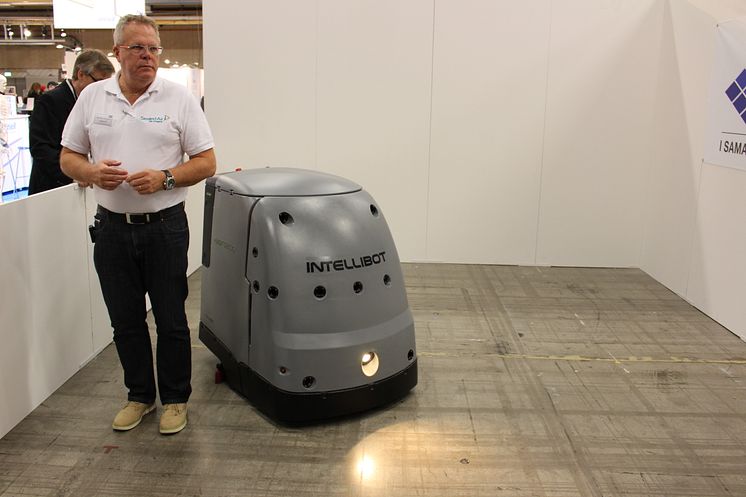 Michael Johnsson visar hur Intellibot ändrar riktning när ett hinder dyker upp.