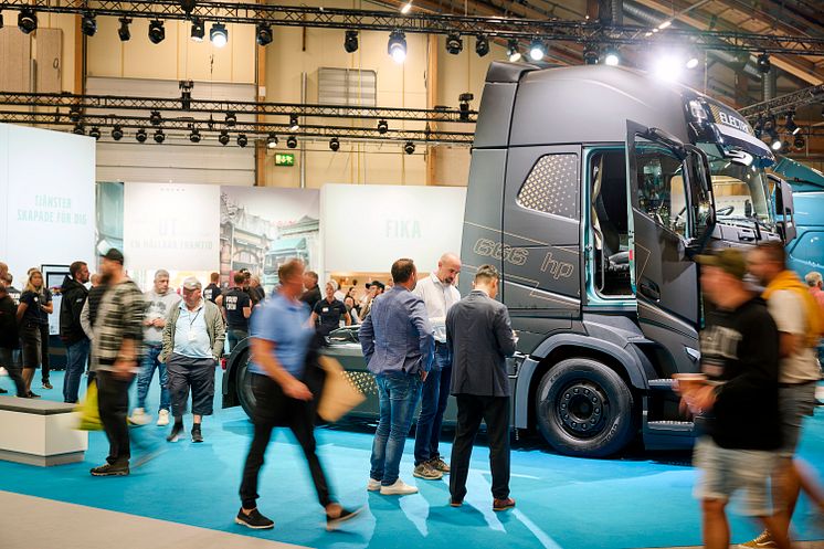 Besökare i monter för Volvo Lastvagnar Sverige på Elmia Lastbil 24-27 augusti 2022.