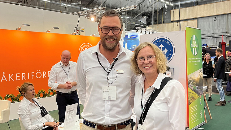 Rickard Gegö, vd, och Birgitta Härle från Sveriges Åkeriföretag är väldigt nöjda med årets scen- och seminarieprogram på Elmia Lastbil.