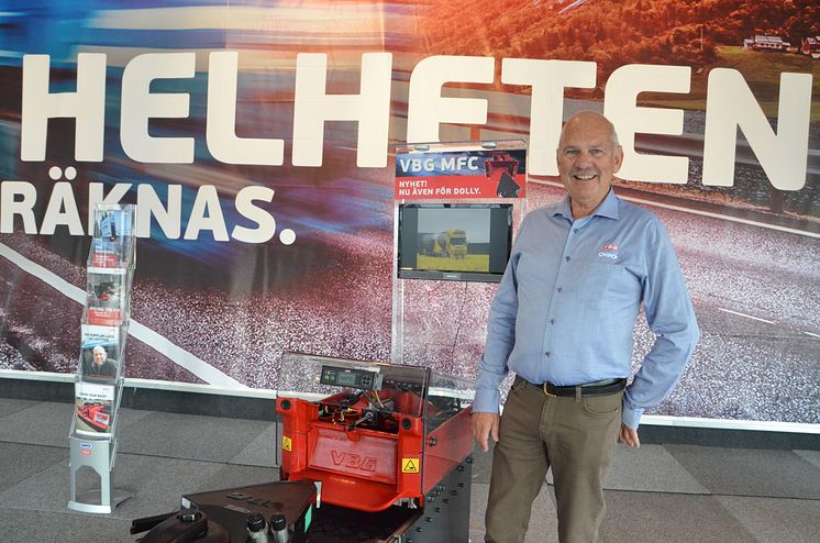 Thomas Bergenklev, marknadschef på VBG Group, visar upp företagets MFC-koppling som nu även finns för Dolly.