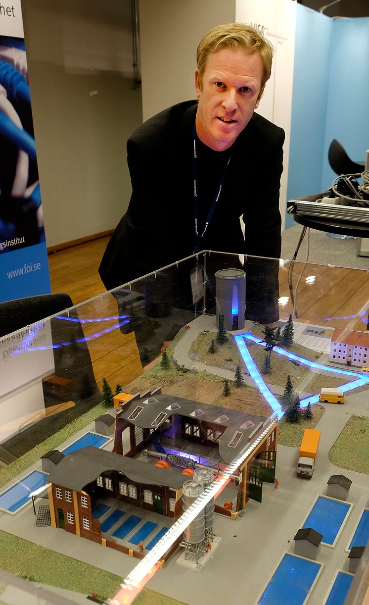 Tommy Gustavsson från FOI vid den modell av ett kommunalt VA-nät som används för att simulera effekterna av cyberattacker.