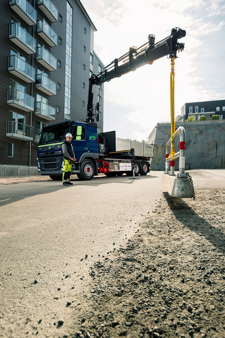 Turebergs Transport AB visade upp en Volvo FM (Euro 6) utrustad med Hiabs mest energieffektiva kran och lastväxlare under Elmia Lastbil 2014. Kranbilen har eldrivet hydraulsystem, ePTO, monterat som tillägg och kranföraren kan arbeta med motorn avstängd – tyst och helt utan avgaser. FOTO: Turebergs Transport AB.