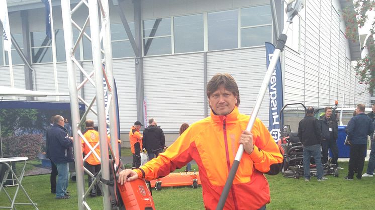 -En unik produkt vi visar, som inte finns hos någon annan leverantör, är vår kombinerade trädbeskärare och midjeröjare. Fördelarna med denna är att den har batterifunktion samt ett vridbart huvud för att passa både skogsröjning och trädbeskärning, säger Magnus Moberg, grönyteinstruktör på Huskvarna.