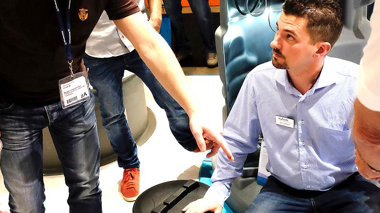 Med en stor fastbränslepanna med cafébord på toppen har Osby Parcas monter onekligen dragit blickarna till sig. – Vi har gjort en strategisk satsning på Elmia Fjärrvärme och bjudit in alla Sveriges Energibolag. Vi kan nu summera att de flesta varit här, säger Ola Svensson på Osby Parca.