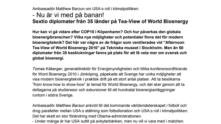 Hur kan vi gå vidare efter COP15 i Köpenhamn? Och hur påverkas den globala bioenergibranschen? Vilka nya möjligheter och potentialer finns det för modern bioenergiteknik? Det här var några av de frågor som ventilerades vid ”Afternoon Tea-View of World Bioenergy 2010” på Tekniska museet i Stockholm. Mer än 60 diplomater från 35 beskickningar fanns på plats för att få veta mer om svensk och global bioenergi.