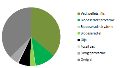 Detta är ett resultat av dels direkt användning av biobränslen för uppvärmning, såsom ved, pellets eller flis, och dels indirekt användning via främst fjärrvärme. Fjärrvärmen använder i snitt 70% biobränsle för värmeproduktionen. Biobränslena härstammar främst från biprodukter och avfall i skogssektorn.