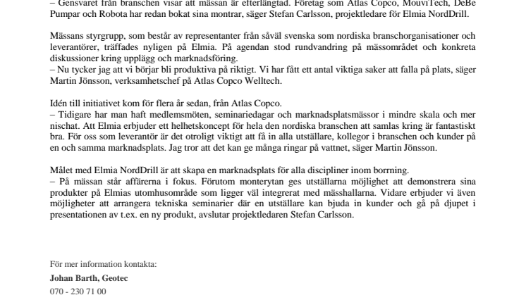 – Gensvaret från branschen visar att mässan är efterlängtad. Företag som Atlas Copco, MouviTech, DeBe Pumpar och Robota har redan bokat sina montrar, säger Stefan Carlsson, projektledare för Elmia NordDrill.