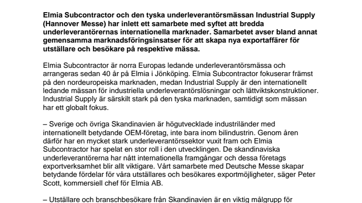 Elmia Subcontractor och den tyska underleverantörsmässan Industrial Supply (Hannover Messe) har inlett ett samarbete med syftet att bredda underleverantörernas internationella marknader. Samarbetet avser bland annat gemensamma marknadsföringsinsatser för att skapa nya exportaffärer för utställare och besökare på respektive mässa.