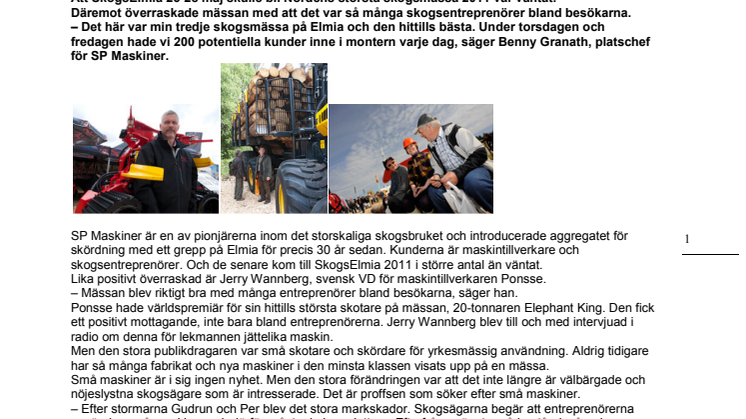 SP Maskiner är en av pionjärerna inom det storskaliga skogsbruket och introducerade aggregatet för skördning med ett grepp på Elmia för precis 30 år sedan. Kunderna är maskintillverkare och skogsentreprenörer. Och de senare kom till SkogsElmia 2011 i större antal än väntat.