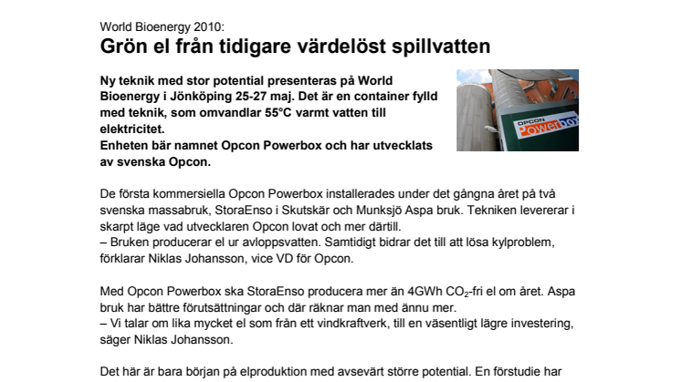 Ny teknik med stor potential presenteras på World Bioenergy i Jönköping 25-27 maj. Det är en container fylld med teknik, som omvandlar 55°C varmt vatten till elektricitet. Enheten bär namnet Opcon Powerbox och har utvecklats av svenska Opcon.