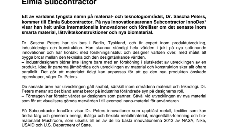 Ett av världens tyngsta namn på material- och teknologiområdet, Dr. Sascha Peters, kommer till Elmia Subcontractor. På nya innovationsarenan Subcontractor InnoDex* visar han helt unika internationella innovationer och föreläser om det senaste inom smarta material, lättviktskonstruktioner och nya biomaterial.