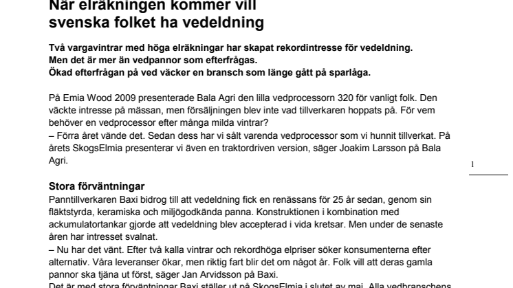 På Emia Wood 2009 presenterade Bala Agri den lilla vedprocessorn 320 för vanligt folk. Den väckte intresse på mässan, men försäljningen blev inte vad tillverkaren hoppats på. För vem behöver en vedprocessor efter många milda vintrar?