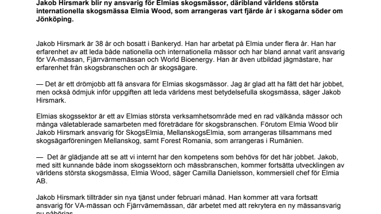 Elmias skogssektor är ett av Elmias största verksamhetsområde med en rad välkända mässor och många väletablerade samarbeten med företrädare för skogsbranschen. Förutom Elmia Wood blir Jakob Hirsmark ansvarig för SkogsElmia, MellanskogsElmia, som arrangeras tillsammans med skogsägarföreningen Mellanskog, samt Forest Romania, som arrangeras i Rumänien.